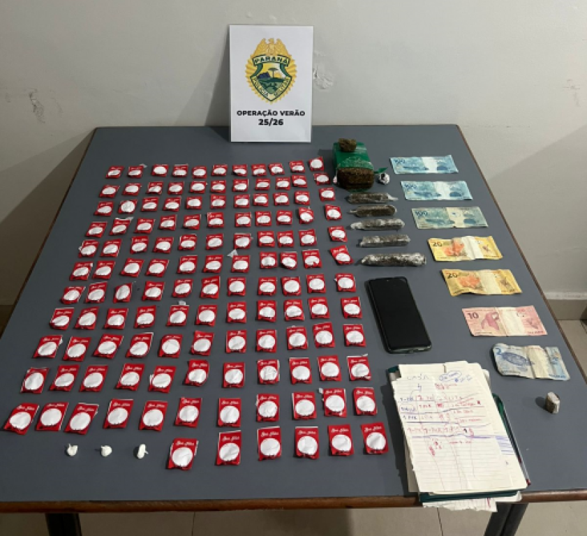 Da ação resultou a apreensão de 621 gramas de substância análoga à maconha, 114 gramas de substância análoga à cocaína, 1 aparelho celular e R$ 353,00 em dinheiro.