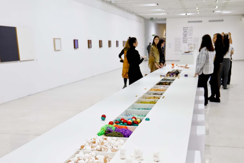 A mostra “Veemente” apresenta obras produzidas com materiais inusitados, como cabelos, asas de borboleta, cascas de ovo e fragmentos de objetos do cotidiano. Com base no conceito de ready-made, Gabriel de La Mora transforma esses elementos em trabalhos visuais únicos, usando repetição e atenção aos detalhes.