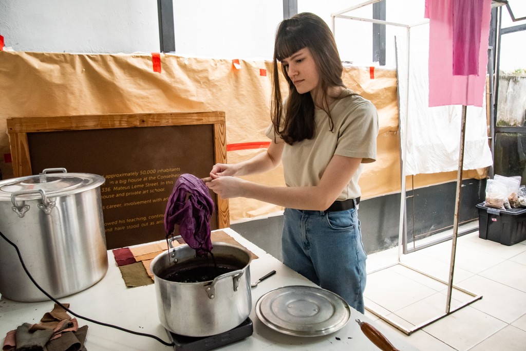 A proposta aprofundou sua pesquisa sobre pigmentos naturais, explorando a criação de novas cores e o tingimento de tecidos a partir de elementos vegetais e minerais. Como parte das atividades, a artista ministrou duas oficinas voltadas ao público jovem, promovendo vivências práticas sobre a extração de pigmentos e a relação entre arte e natureza.