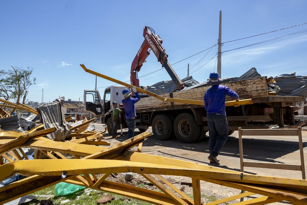 Contando com uma frota de 139 máquinas pesadas e a mobilização de mão de obra numerosa, as ruas de Rio Bonito do Iguaçu foram quase completamente desobstruídas nesta terça-feira (11). Isso não significa que o trânsito esteja fluindo normalmente na cidade, que teve 90% de suas estruturas atingidas por um tornado na última sexta-feira (7), resultando na destruição de residências e prédios públicos. Como há muitos trabalhadores na rua, além dos equipamentos de grande porte, formando o esforço de limpeza e retirada dos entulhos nos lotes danificados, a movimentação nas vias ainda demanda atenção e paciência.