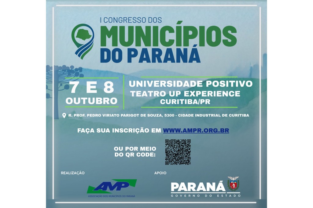 Com apoio do Governo do Paraná, Curitiba recebe na próxima semana, nos dias 7 e 8 de outubro, o I Congresso dos Municípios do Paraná, promovido pela Associação dos Municípios do Paraná (AMP) e Associação dos Municípios da Região Metropolitana de Curitiba (Assomec). O governador Carlos Massa Ratinho Junior vai participar da abertura do encontro. O evento será realizado na Universidade Positivo (Auditório Viasoft Experience).