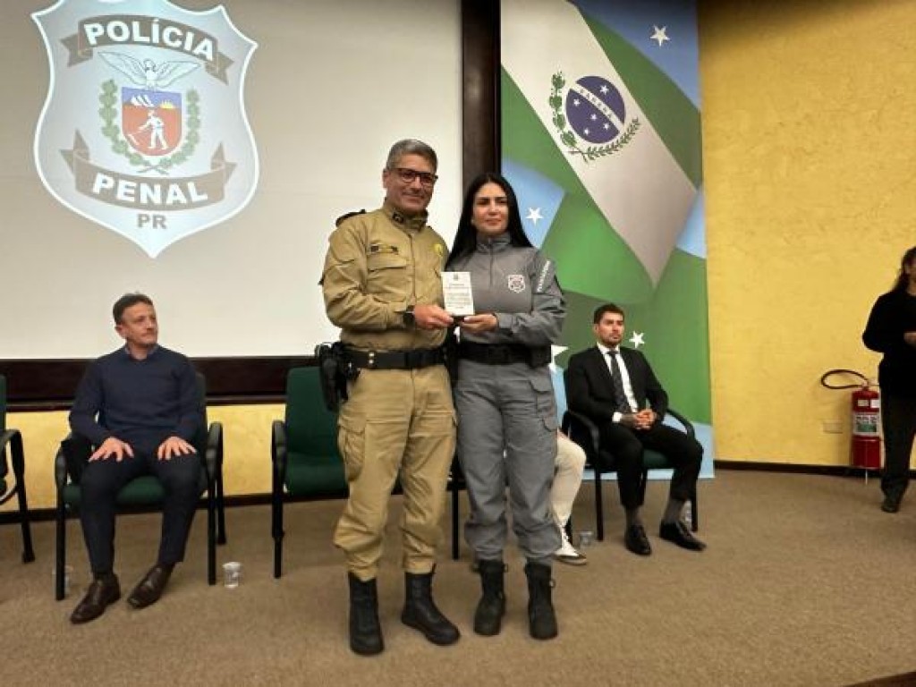 O Comandante-Geral da PMPR, coronel Jefferson Silva, esteve presente na solenidade e recebeu a homenagem em nome da corporação, entregue pela Diretora-Geral da Polícia Penal, Ananda Chalegre.