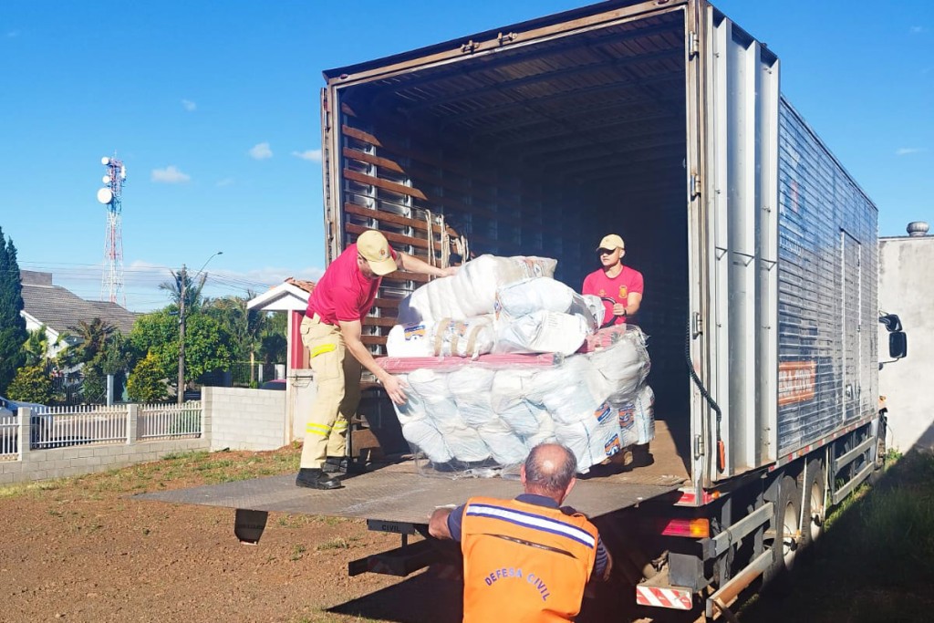 Nesta sexta-feira (26), mais materiais também seguem para Santa Maria do Oeste, complementando o que já foi enviado para o município. São 7.800 telhas, 356 cestas básicas, 356 kits higiene, 356 kits limpeza, 356 kits dormitório e 243 colchões.