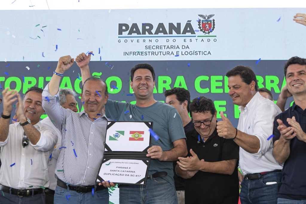 ACORDO – A duplicação da PR-412 foi desenvolvida de forma integrada com os projetos do lado catarinense, garantindo continuidade da rodovia na divisa entre os estados. Durante o evento, Ratinho Junior e o governador de Santa Catarina, Jorginho Mello, assinaram o convênio que permite o avanço do acordo judicial entre os dois estados, homologado pelo Supremo Tribunal Federal, que encerrou uma disputa iniciada em 1991 relacionada a royalties de petróleo.