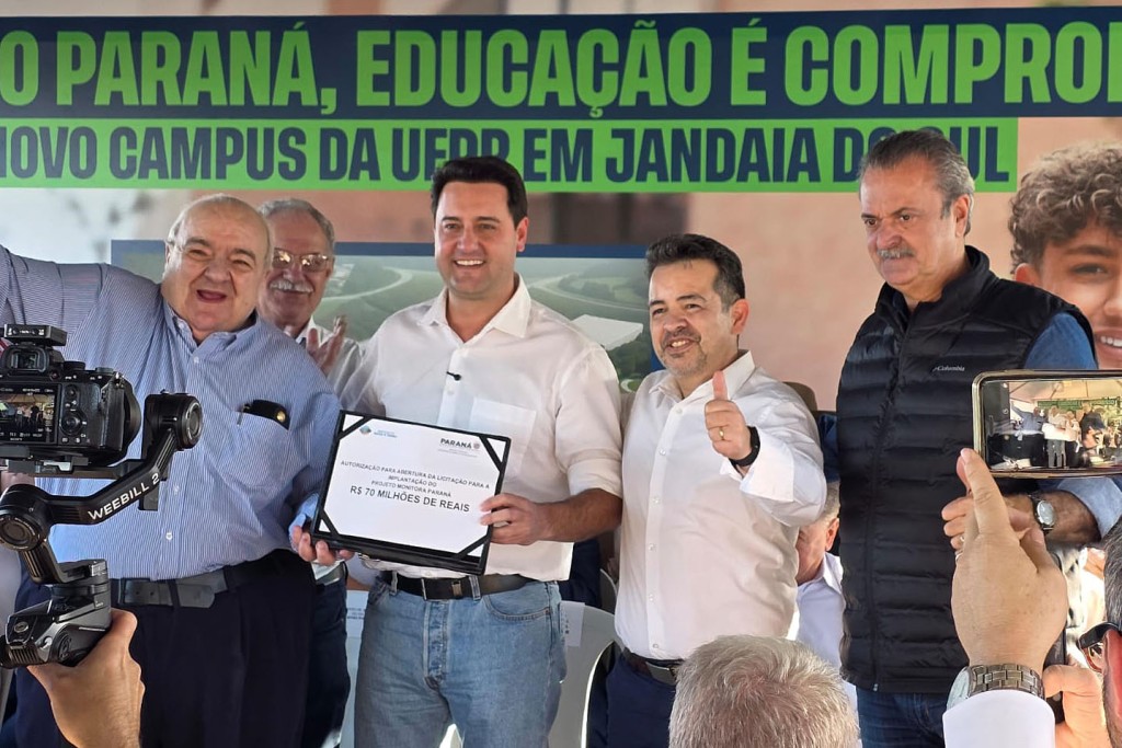 PRESENÇAS – Também acompanharam o evento os secretários estaduais João Carlos Ortega (Casa Civil), Guto Silva (Cidades), Márcio Nunes (Agricultura e Abastecimento), Beto Preto (Saúde), Sandro Alex (Infraestrutura e Logística) e Alex Canziani (Inovação e Inteligência Artificial), além do chefe da Casa Militar, coronel Marcos Tordoro; o presidente da Assembleia Legislativa do Paraná, deputado estadual Alexandre Curi; a deputada federal Luísa Canziani; os deputados estaduais Anibelli Neto, Adriano José e Pedro Paulo Bazana; o prefeito de Jandaia do Sul, Benedito José Pupio (Ditão); o reitor da Universidade Federal do Paraná, Marcos Sunye; e o subchefe da Casa Civil, Lúcio Tasso.