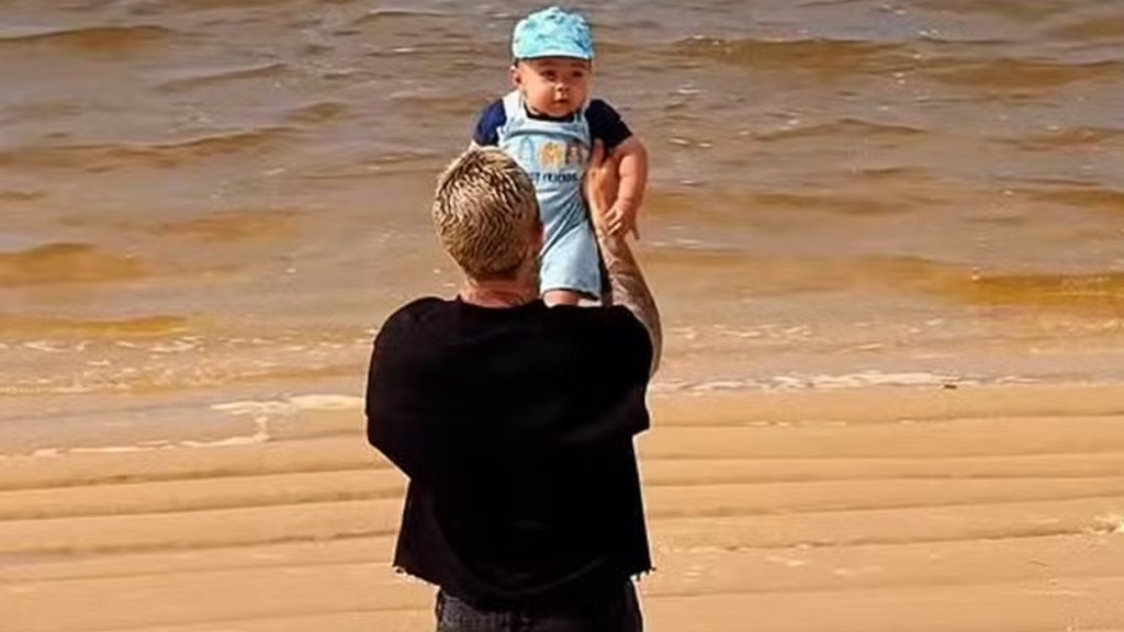 O funkeiro publicou registros do bebê curtindo a areia e o mar em Maceió, Alagoas, durante uma viagem em família. “Primeira vez na praia e com os pés na areia”, escreveu o funkeiro, encantado com o momento.
