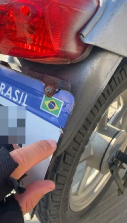 Durante a Operação Dia do Trabalho – Fiscalização de Trânsito, realizada no sábado, dia 3 de maio, agentes de trânsito abordaram uma motocicleta que circulava com uma placa de identificação feita artesanalmente em papelão, com números e letras colados por meio de adesivos. Apesar de conter os caracteres corretos correspondentes à placa original, o item improvisado está completamente fora dos padrões estabelecidos pelo Código de Trânsito Brasileiro (CTB).