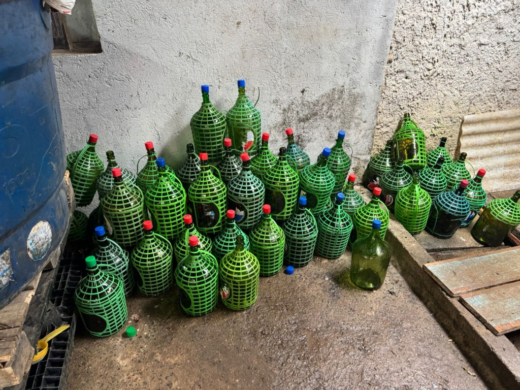 “Também foram localizados diversos garrafões de vidro espalhados pelo chão, já prontos para o envase”, destaca a delegada.