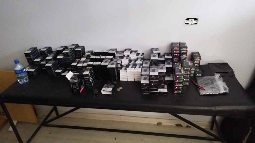No local, foram apreendidos 820 cigarros eletrônicos avaliados em cerca de R$ 70 mil, anabolizante oxandrolona 5mg, munições calibre .635 e .38, máquinas de cartão e a CNH do líder do grupo.