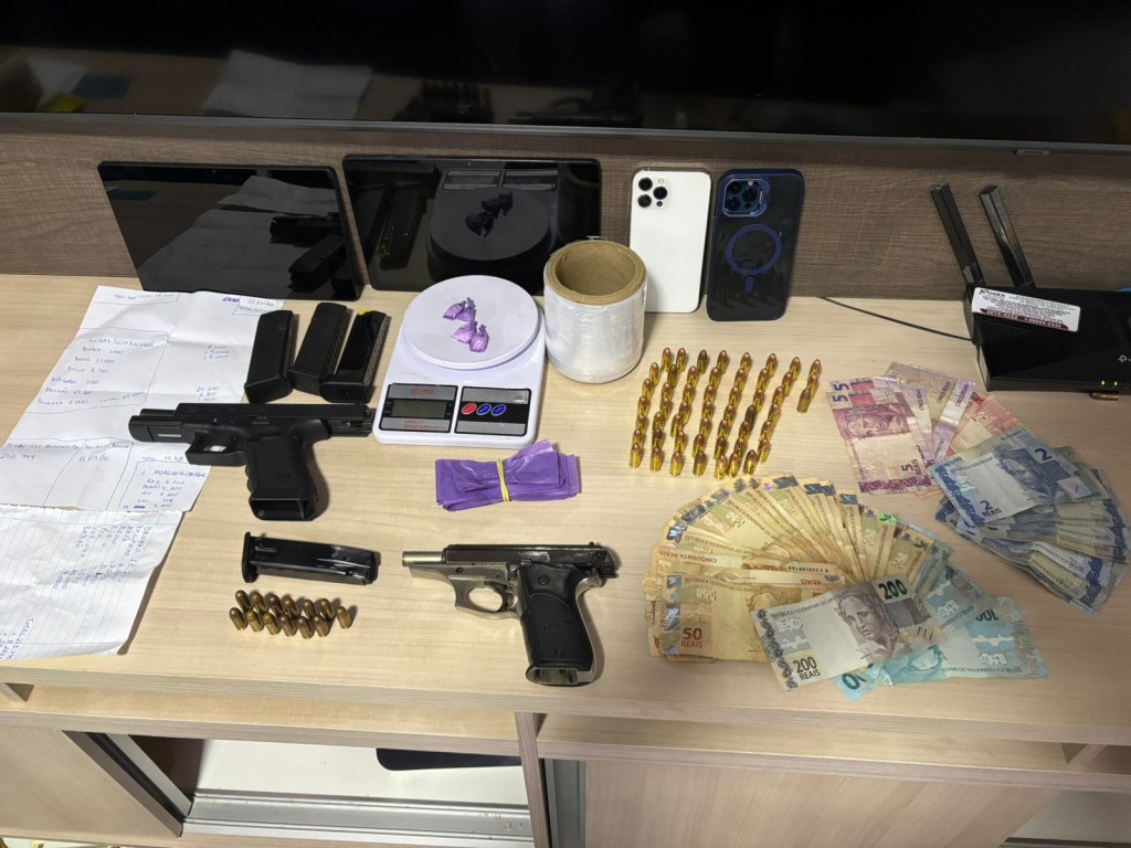 Também foram apreendidas porções de maconha, balança de precisão, material para embalar drogas, três armas de fogo, munições, dinheiro em espécie, um veículo, além de aparelhos celulares. Os ilícitos foram localizados com o auxílio de cães de faro da PCPR.