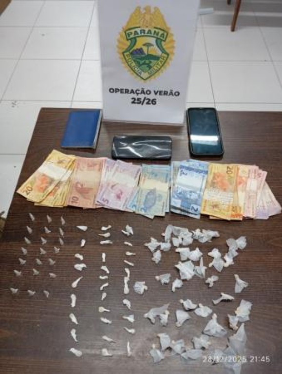 No interior do imóvel, a proprietária informou que seu marido havia se evadido do local momentos antes, levando consigo entorpecentes. Um adolescente foi apreendido e, juntamente com o masculino abordado e todo o material ilícito localizado, foi encaminhado à Delegacia de Polícia Civil do Paraná.