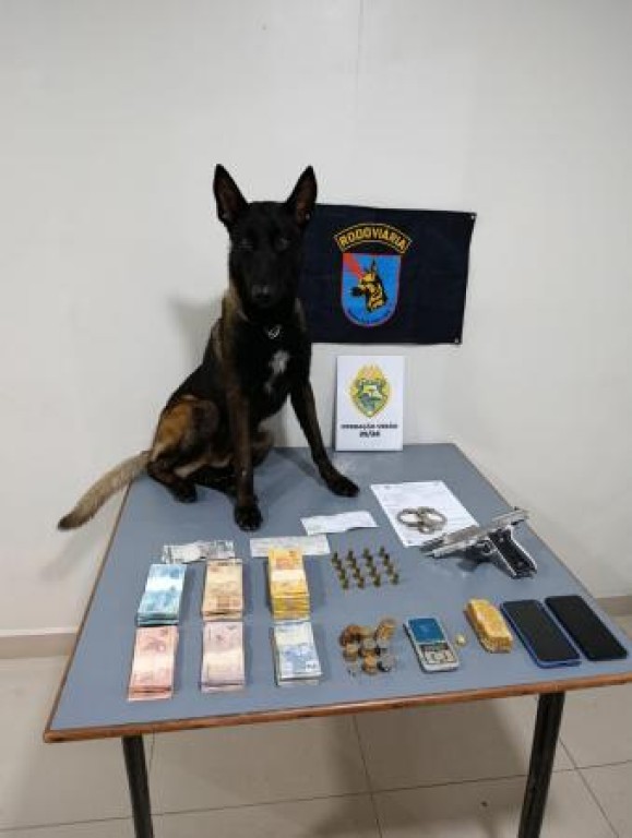 Para a vistoria no terreno, foi fundamental o apoio do Canil do Batalhão de Polícia Rodoviária (BPRv). O cão de faro indicou um ponto exato no solo onde os policiais escavaram e encontraram, enterrados, uma pistola calibre 9mm municiada e porções de crack. No interior da residência, as equipes localizaram o restante do material ilícito.