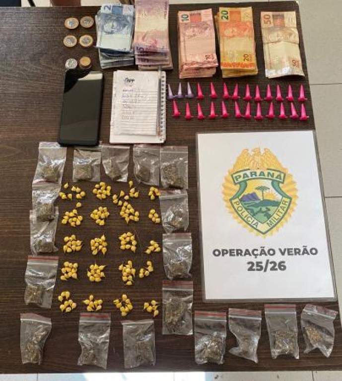 Na tarde desta quinta-feira (5), a Polícia Militar do Paraná (PMPR) realizou uma ação de combate ao tráfico de drogas no Balneário Gaivotas, em Matinhos. Por volta das 15h, uma equipe em patrulhamento pela Avenida do Canal notou um homem prestes a entregar um objeto a uma mulher. Ao perceberem a presença da viatura, os dois se abraçaram rapidamente para tentar passar a impressão de que eram apenas um casal, em uma tentativa de evitar a abordagem policial.