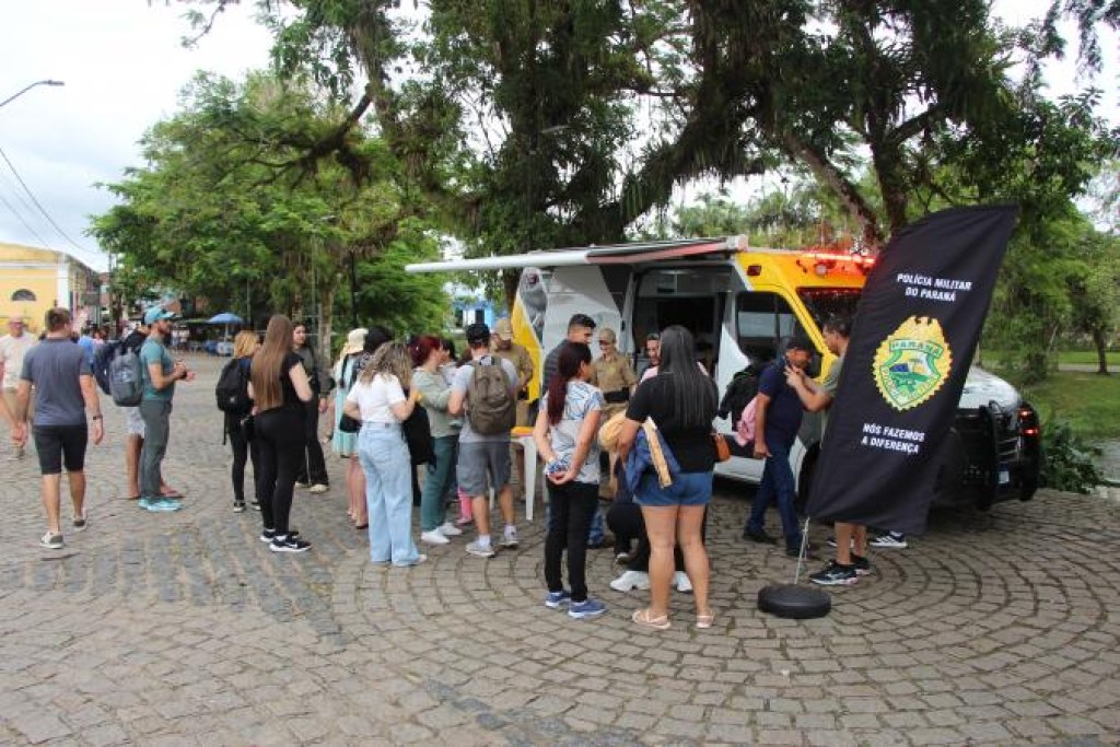 A Polícia Militar do Paraná realizou, neste domingo (4), uma ação comunitária no município de Morretes, com foco na aproximação com a população e no fortalecimento do vínculo de confiança entre a corporação e a comunidade. A iniciativa priorizou o público infantil, com a entrega de pulseirinhas de identificação, além de orientações preventivas aos responsáveis, contribuindo para a segurança de crianças em locais com grande circulação de pessoas.