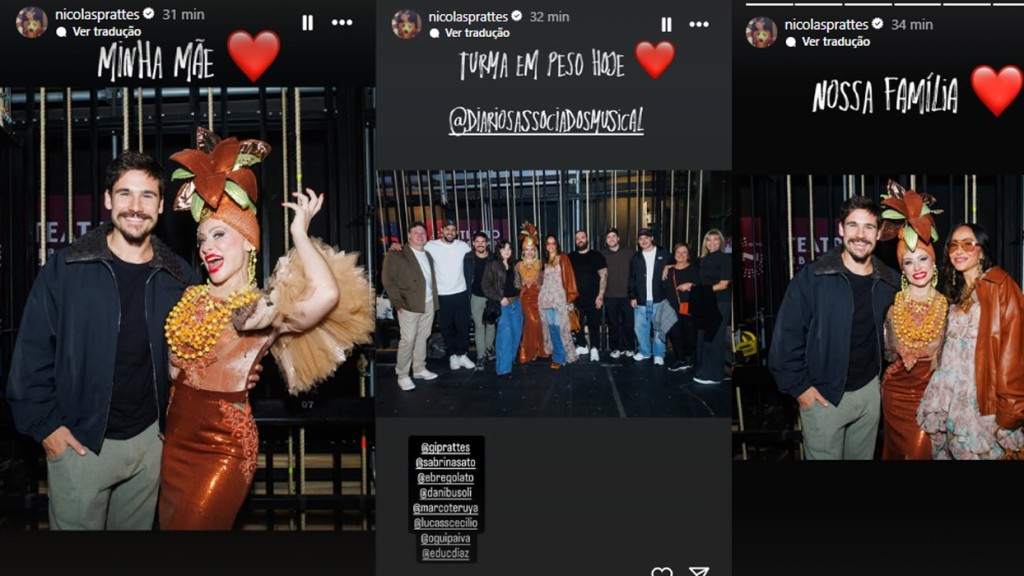 Sabrina Sato, 44, e Nicolas Prattes, 28, prestigiaram Giselle De Prattes, mãe do ator, na apresentação do espetáculo Chatô e os Diários Associados, 100 Anos de uma Paixão, neste domingo (27), no Teatro Liberdade, em São Paulo. No musical, Giselle interpreta Carmen Miranda (1909–1955) e divide o palco com Cláudio Lins e Stepan Nercessian.